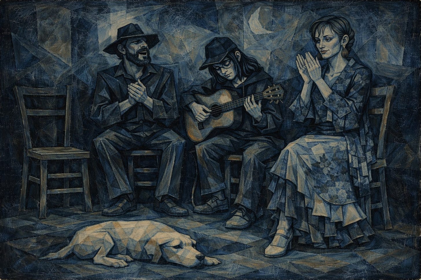 The cantaor (singer) and tocaor (guitarist) sat aligned on straight-backed chairs, leaving a third chair empty.